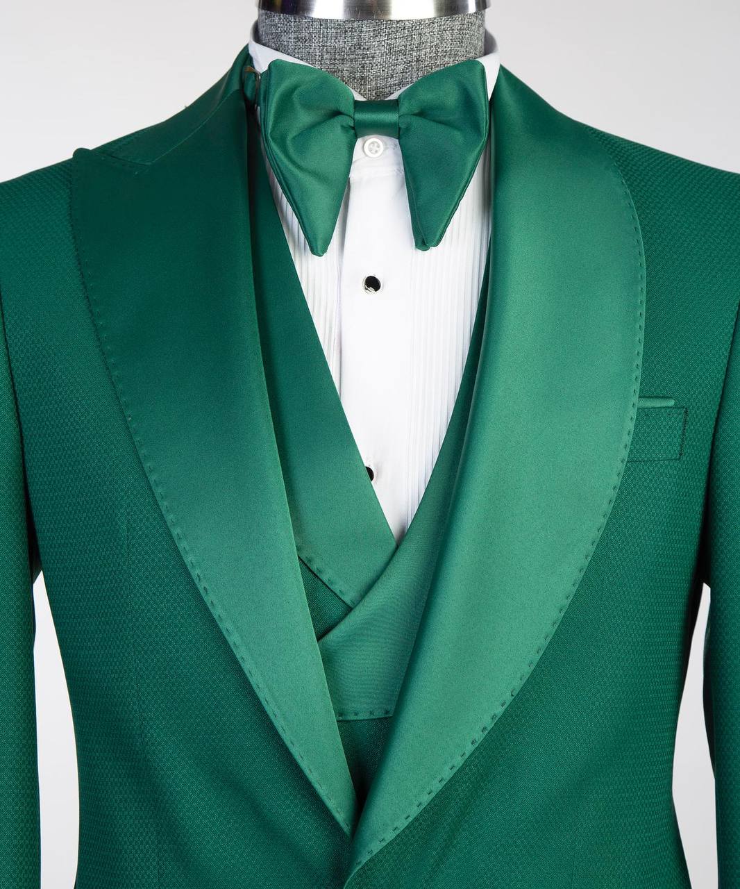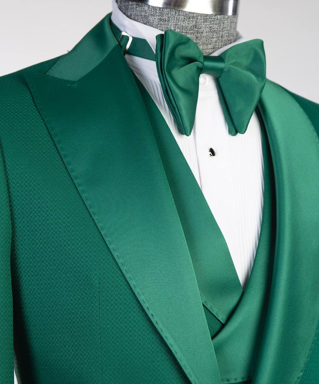 Discover elegance with our exclusive Green Tuxedo, A suit with a peak lapel on one side and a shawl lapel on the other side a masterpiece designed for the modern gentleman. Crafted from premium quality fabric, this ensemble features a luxurious satin lapel, complemented by a matching vest and classic trouser, exuding sophistication.